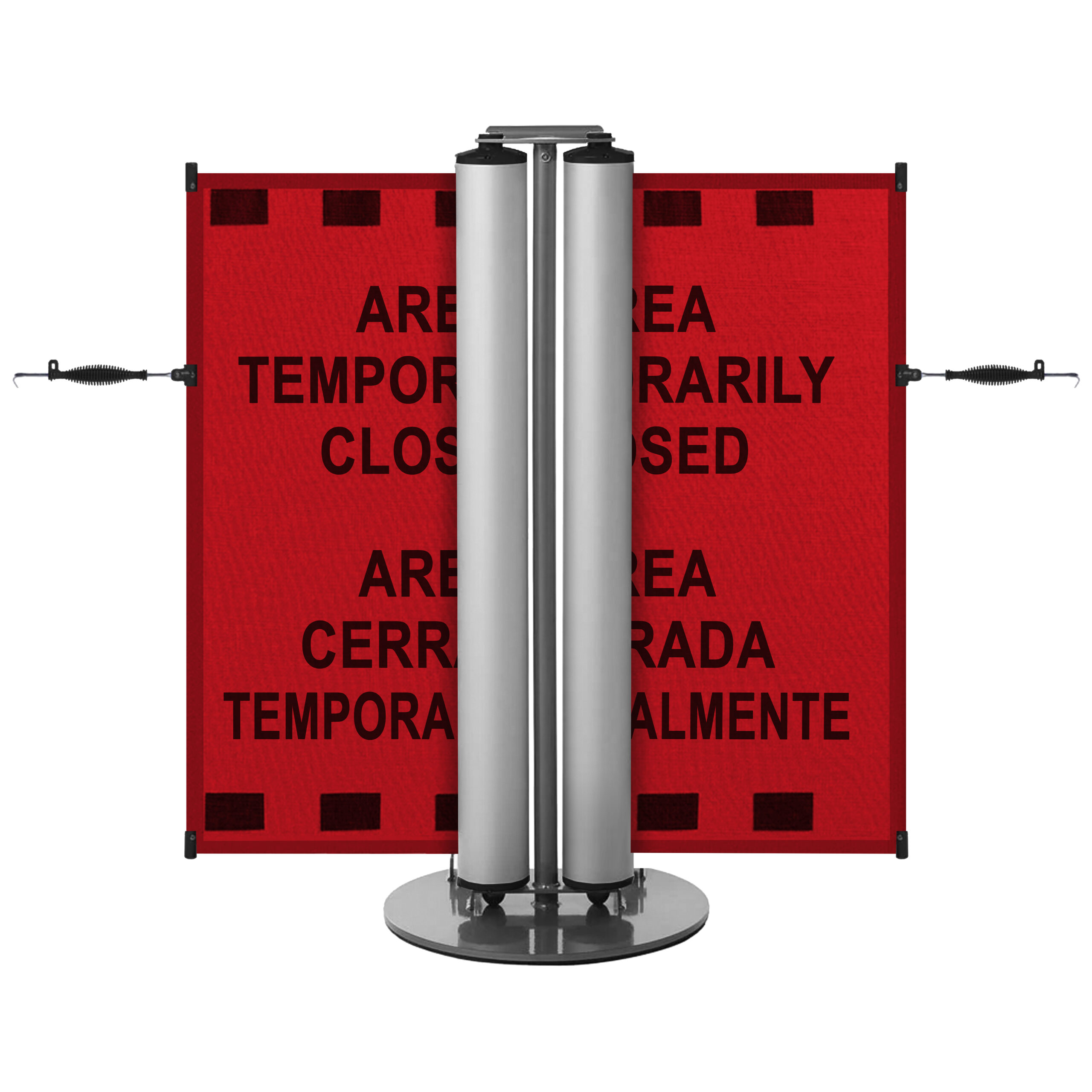 - Preprinted messaging (“Area Temporarily Closed”) in blue, orange, red, and yellow mesh fabric that extends up to 28 feet