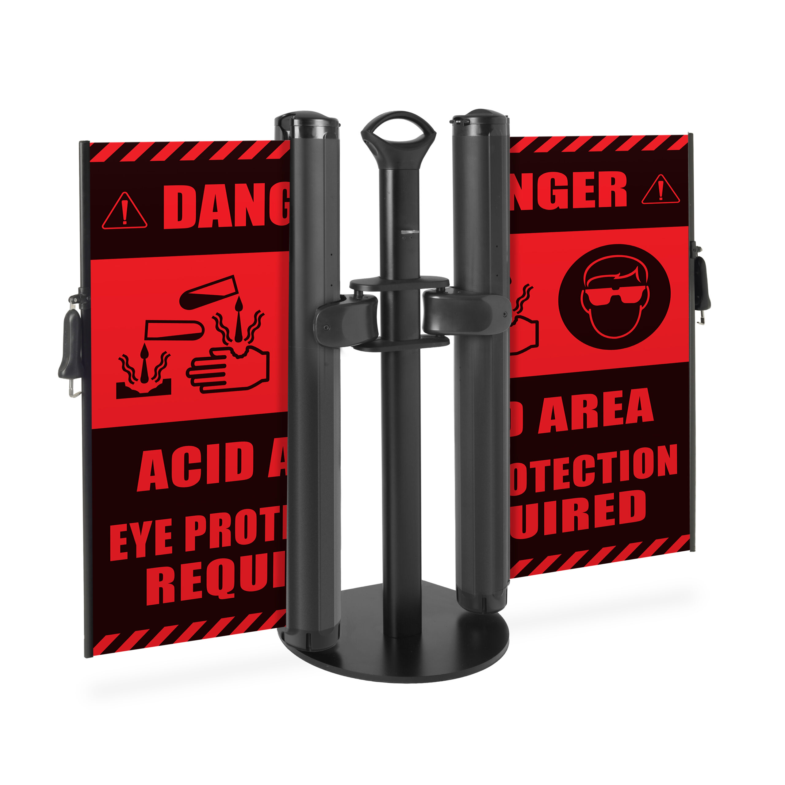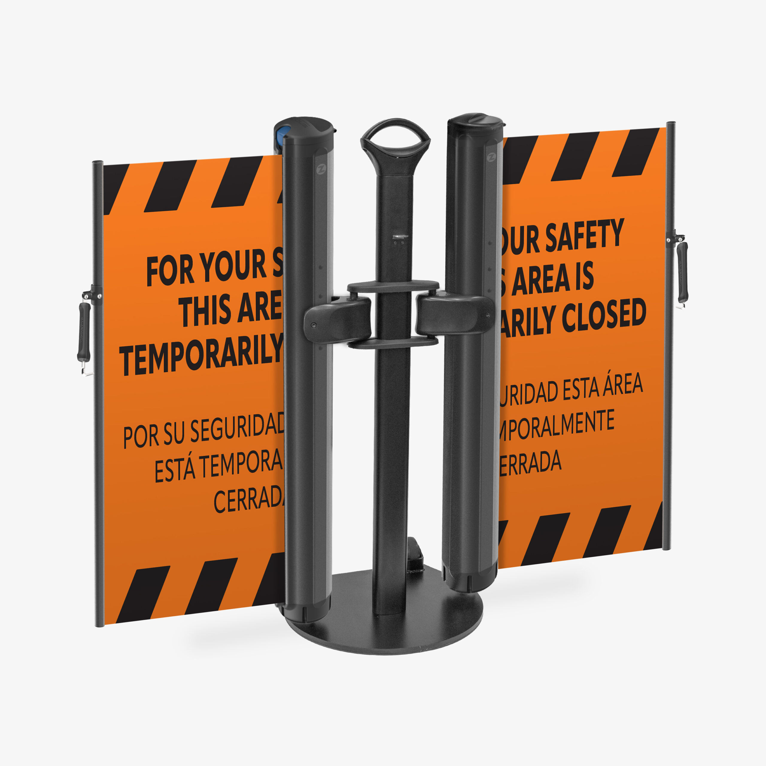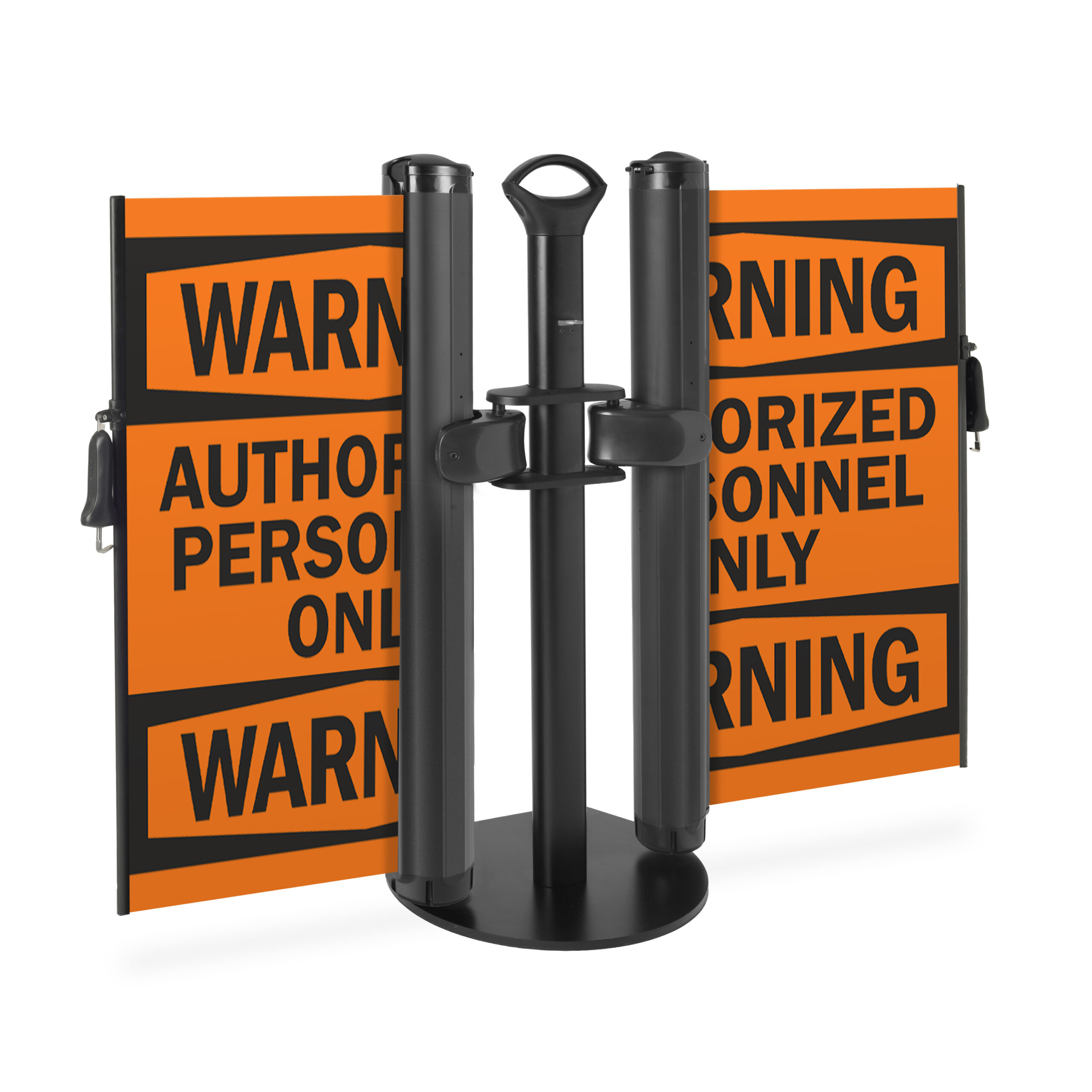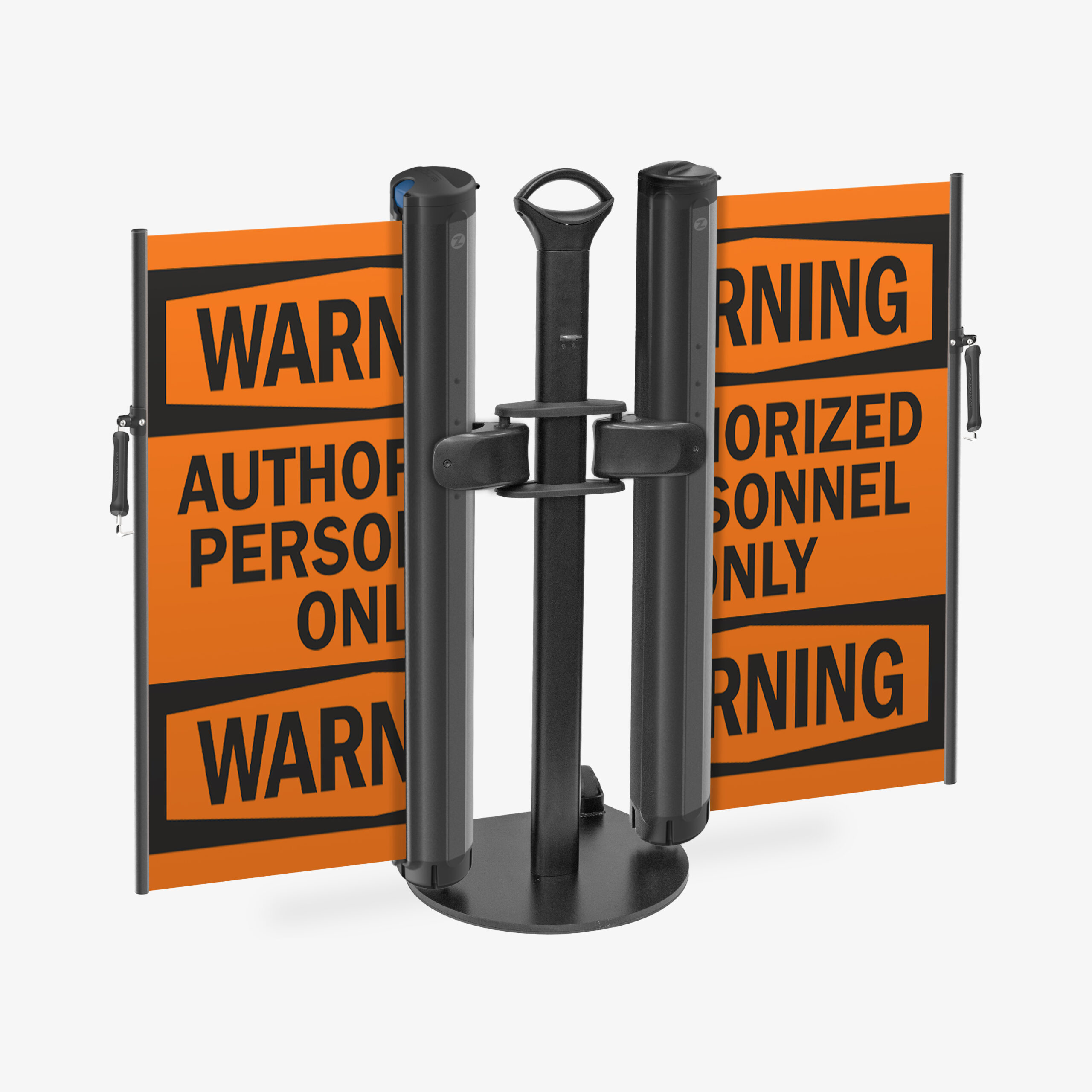 The ZonePro® Plus Dual Mobile Stand takes mobile safety solutions to the next level with advancements in customization, flexibility, and performance. Designed for larger spaces and wide aisles, this unit offers dual retractable banners for increased coverage, enhanced performance, and optimal communication. Ideal for expansive industrial and commercial environments, the ZonePro Plus Dual Mobile Stand is perfect for managing foot traffic, cordoning off hazardous areas, or delineating workzones. Its dual banners allow for maximum visibility and impact, while its durable yet mobile design ensures easy repositioning and swift deployment.