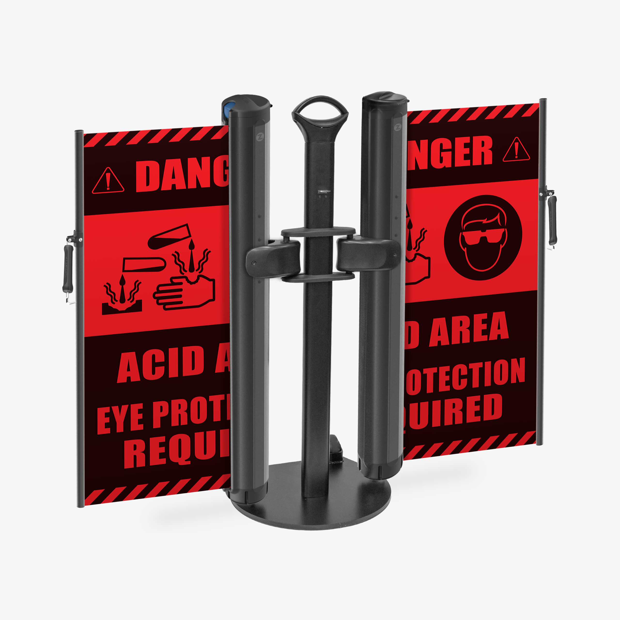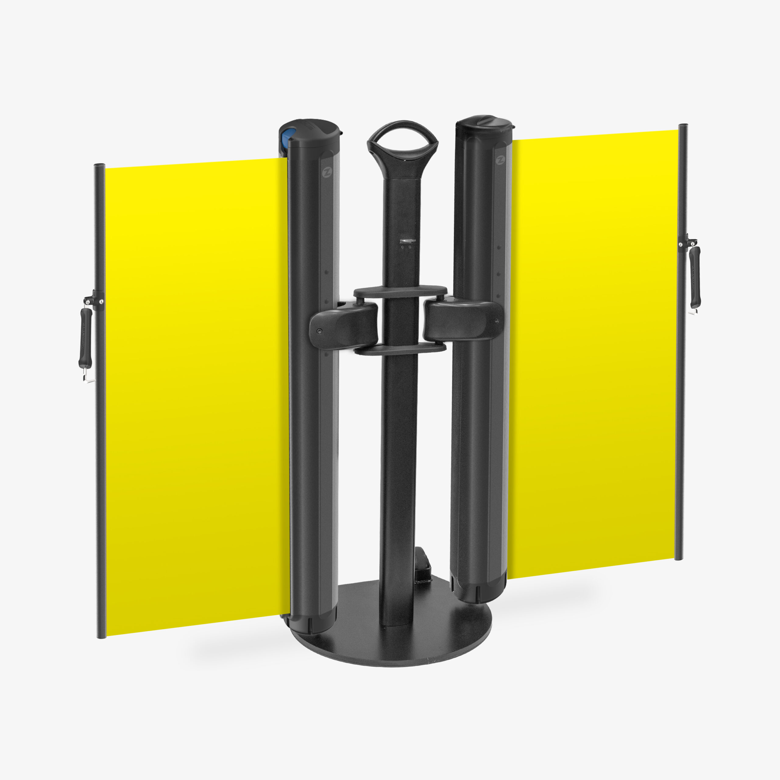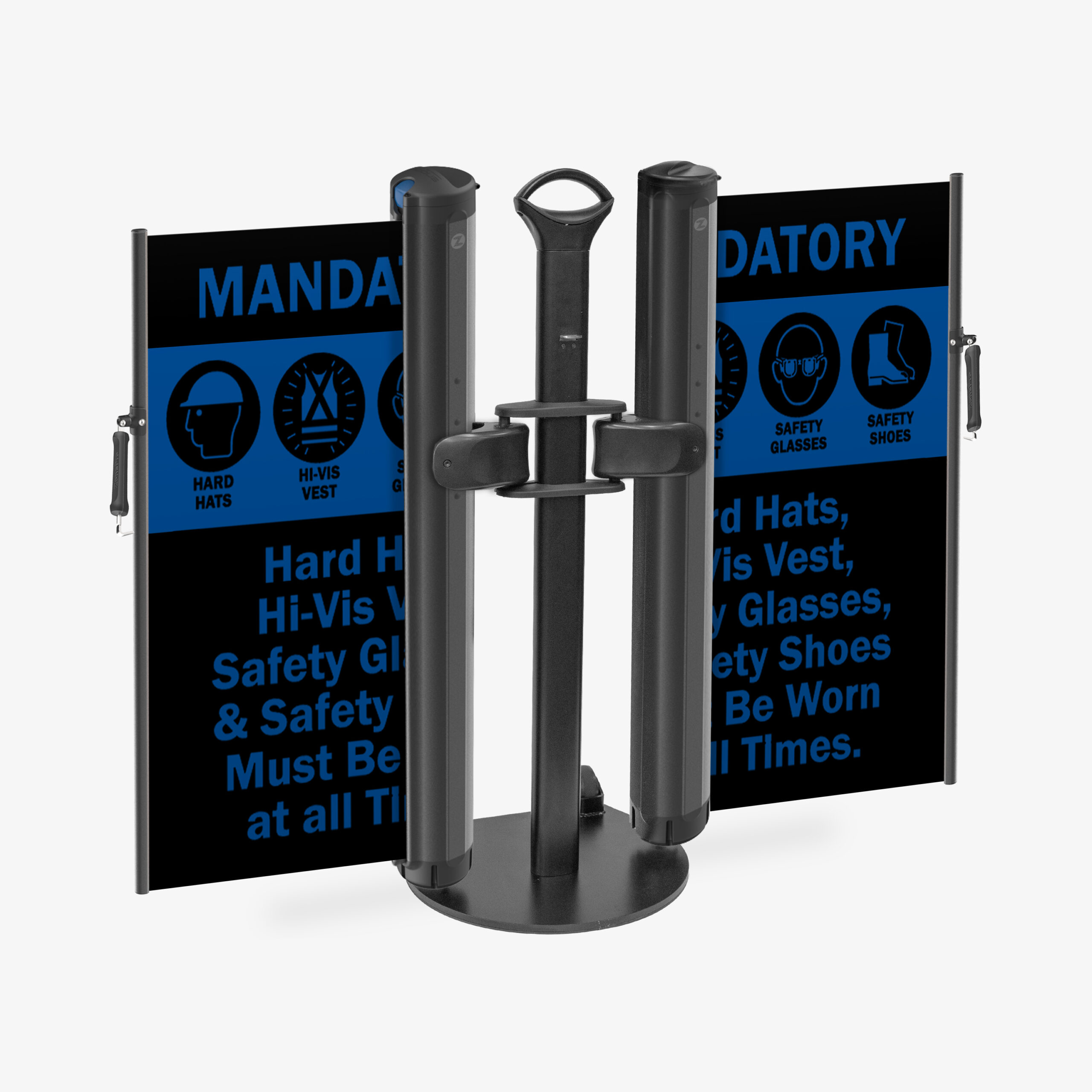The ZonePro® Plus Dual Mobile Stand takes mobile safety solutions to the next level with advancements in customization, flexibility, and performance. Designed for larger spaces and wide aisles, this unit offers dual retractable banners for increased coverage, enhanced performance, and optimal communication. Ideal for expansive industrial and commercial environments, the ZonePro Plus Dual Mobile Stand is perfect for managing foot traffic, cordoning off hazardous areas, or delineating workzones. Its dual banners allow for maximum visibility and impact, while its durable yet mobile design ensures easy repositioning and swift deployment.