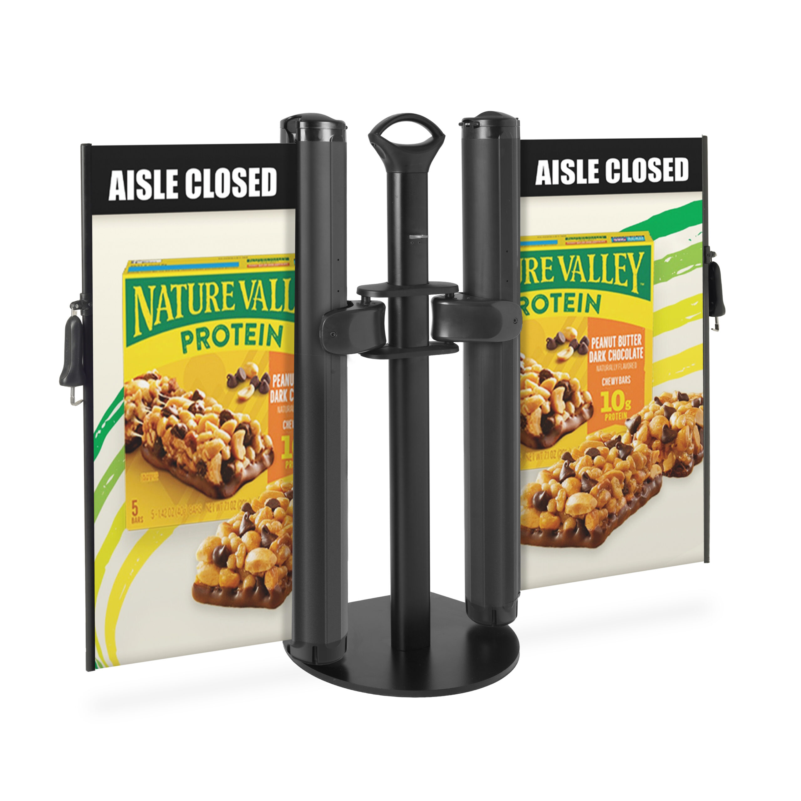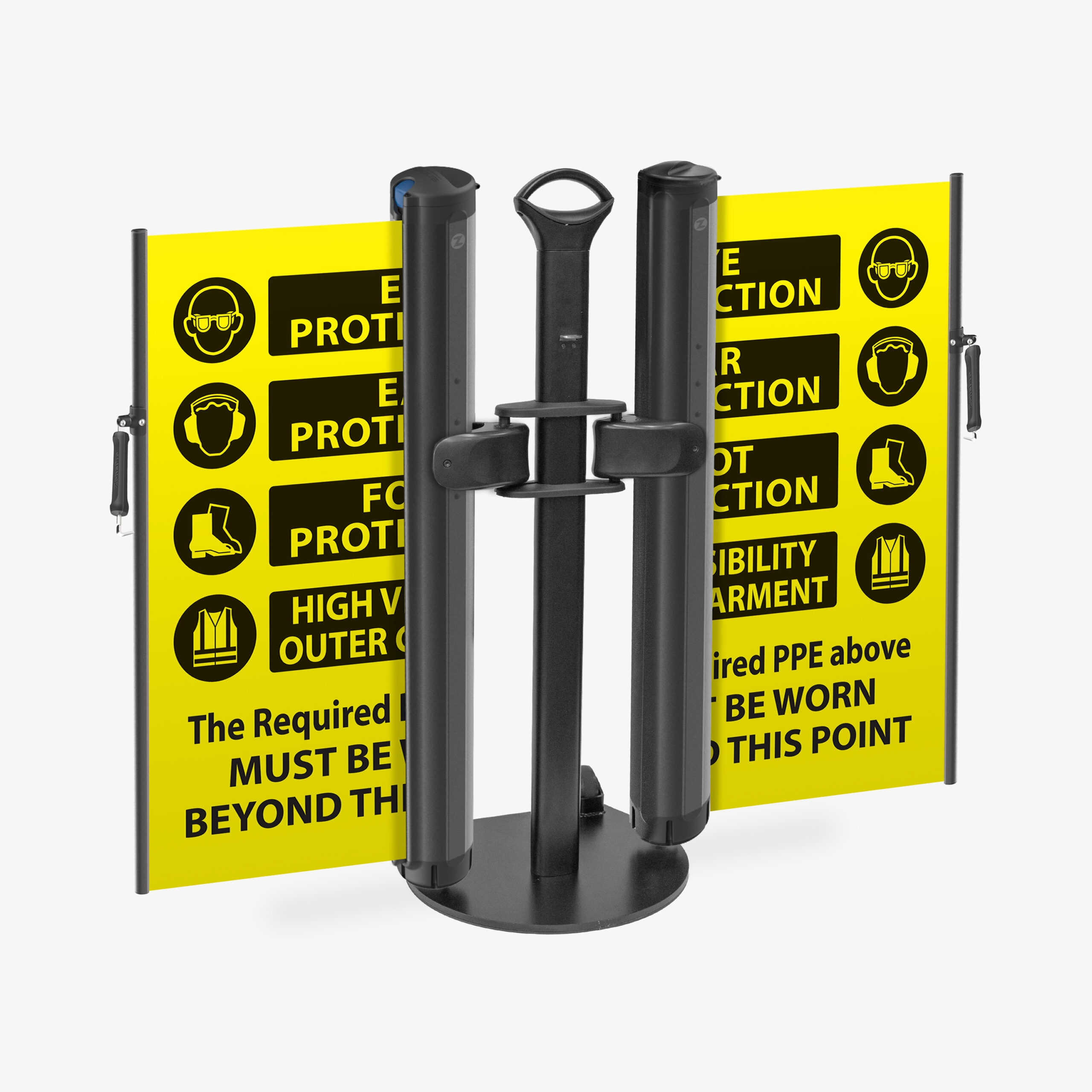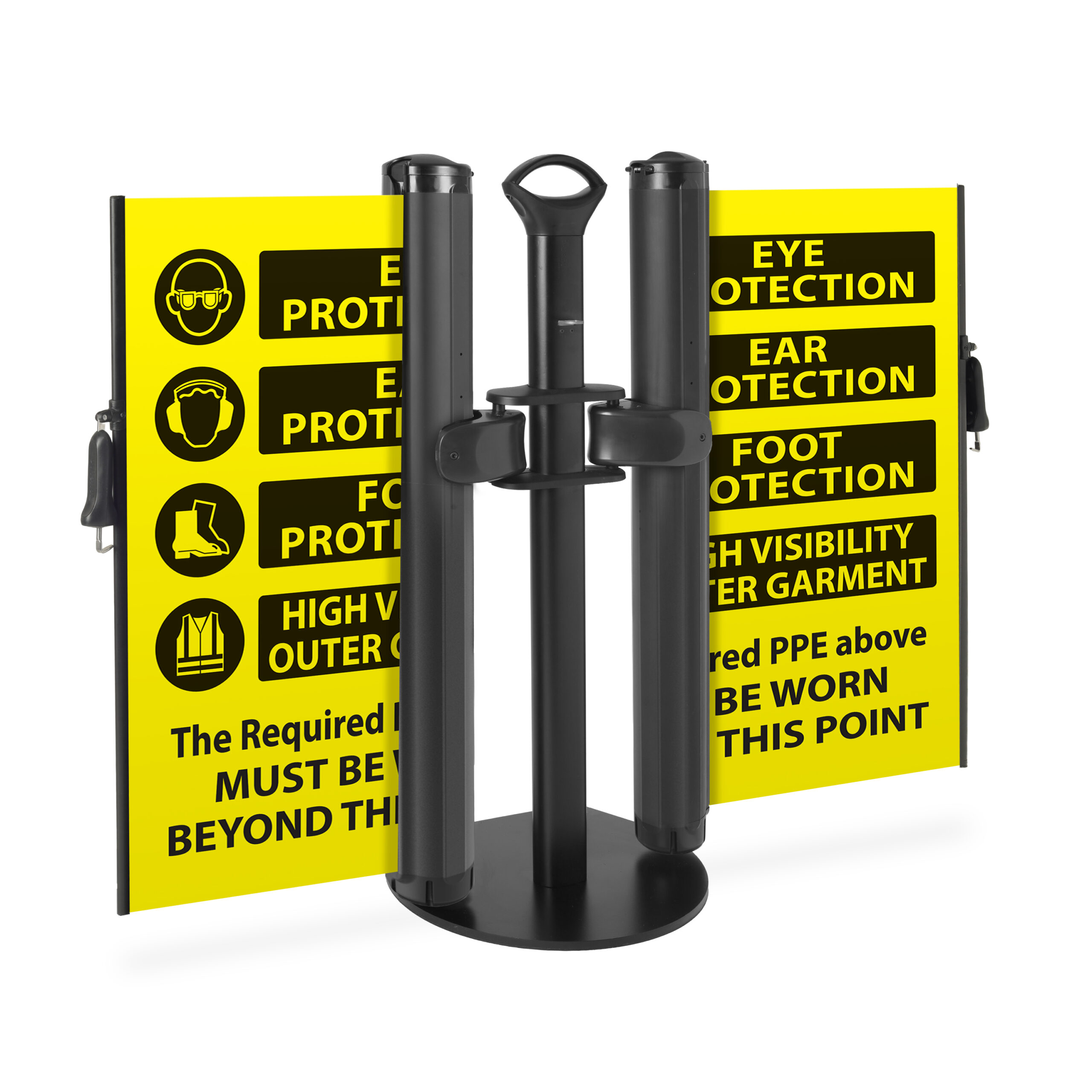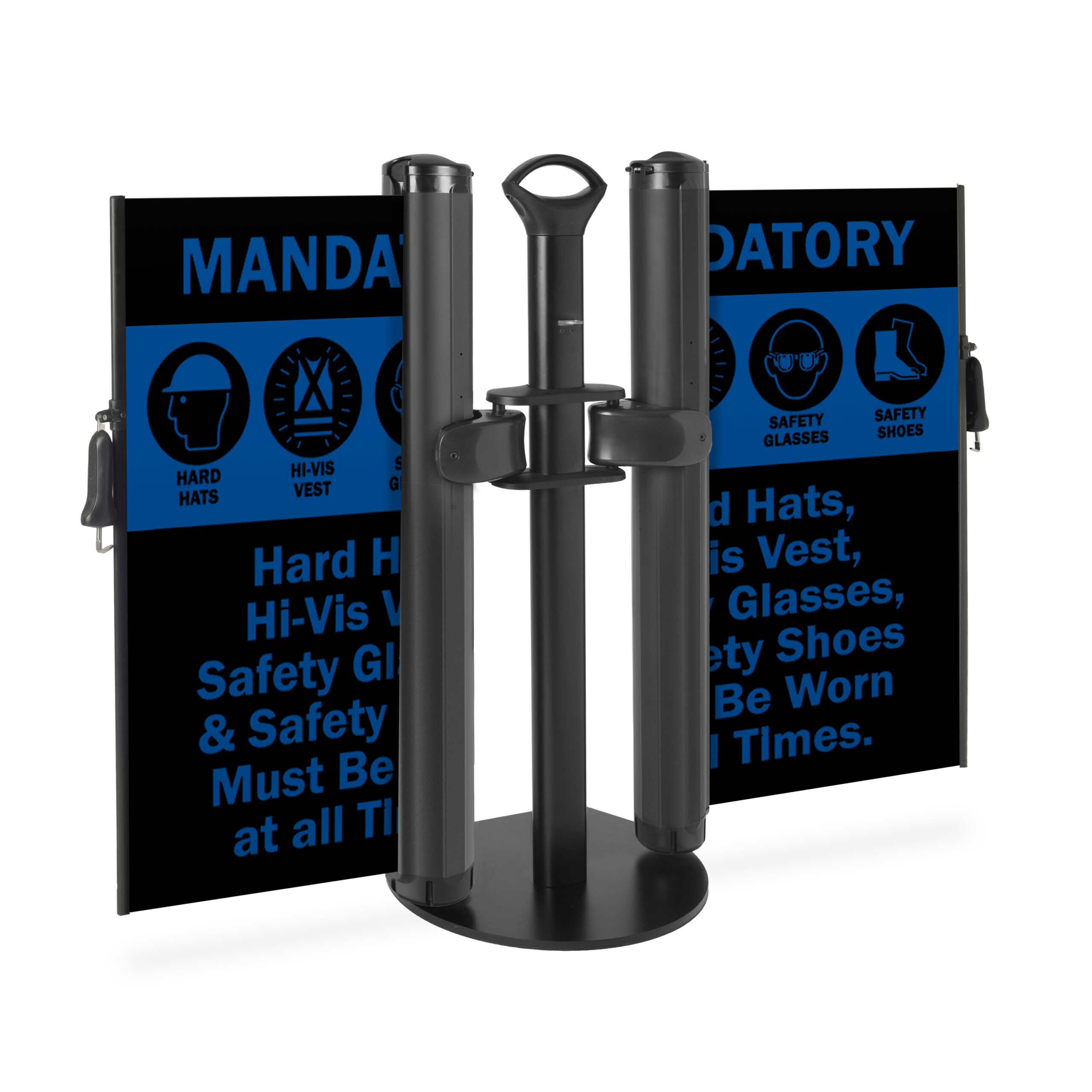 The ZonePro® Plus Dual Mobile Stand takes mobile safety solutions to the next level with advancements in customization, flexibility, and performance. Designed for larger spaces and wide aisles, this unit offers dual retractable banners for increased coverage, enhanced performance, and optimal communication. Ideal for expansive industrial and commercial environments, the ZonePro Plus Dual Mobile Stand is perfect for managing foot traffic, cordoning off hazardous areas, or delineating workzones. Its dual banners allow for maximum visibility and impact, while its durable yet mobile design ensures easy repositioning and swift deployment.
