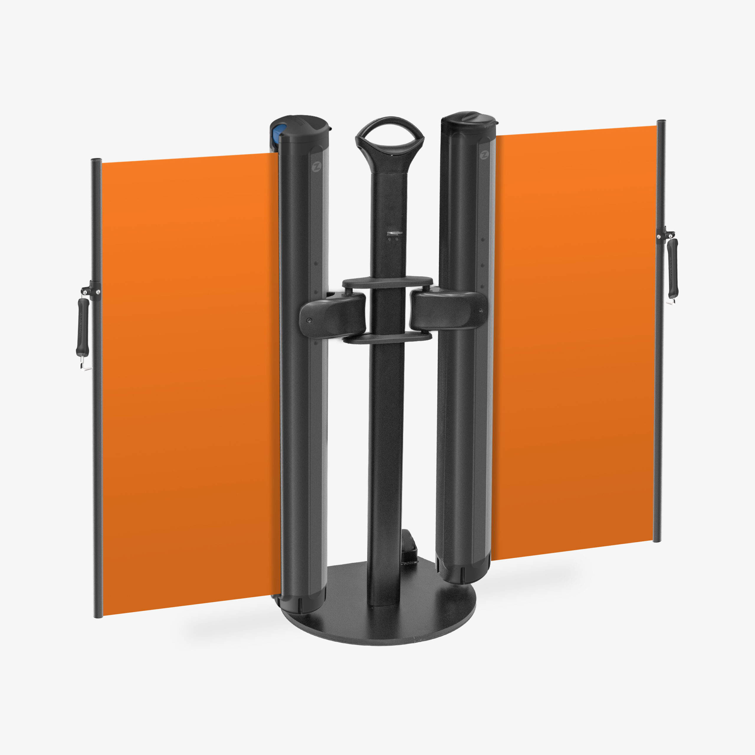 Specially engineered anti-sagging mechanism ensures banners remain taut, even on uneven surfaces. Additionally, exclusive swivel technology allows the dual banners to pivot up to 90° in either direction for versatile coverage.
