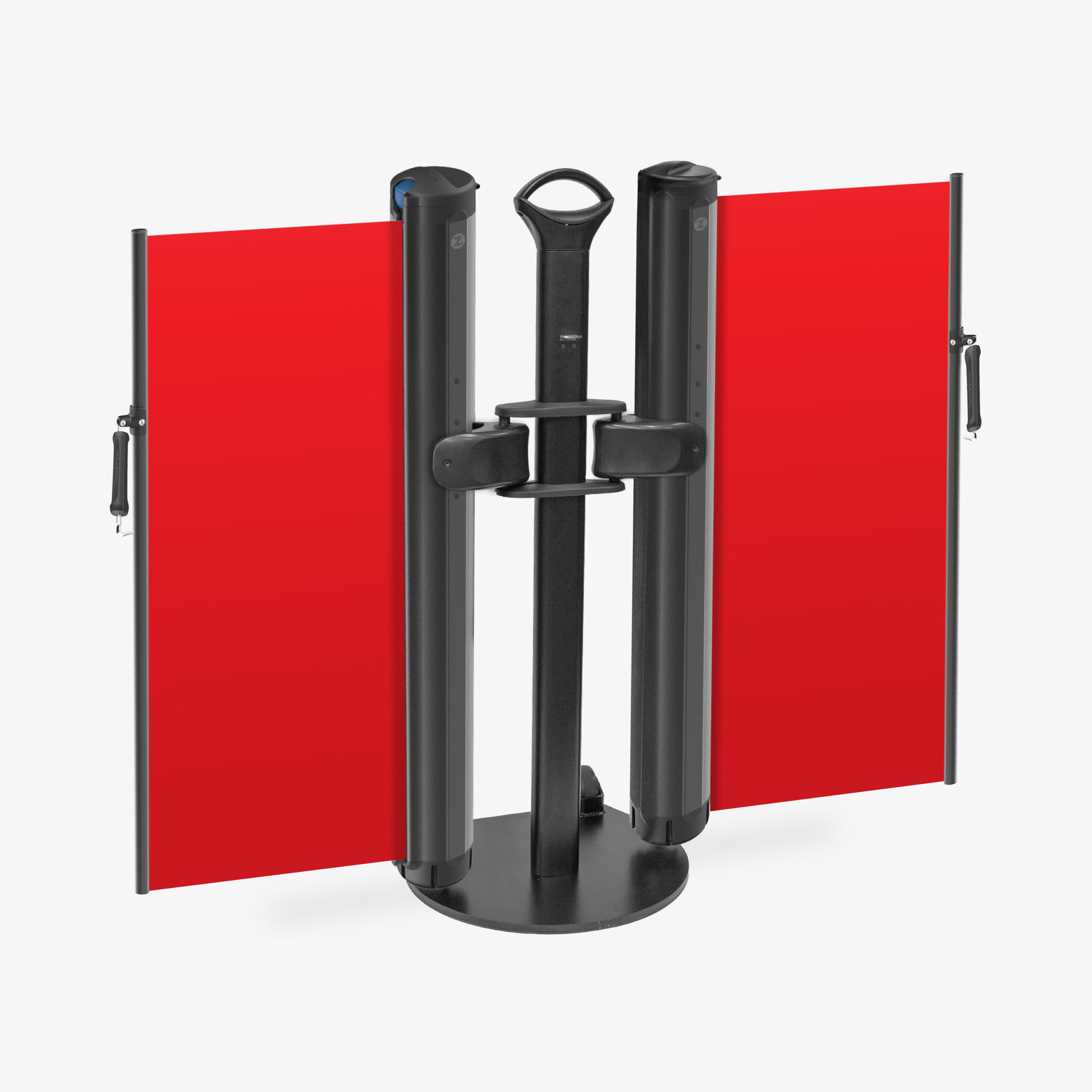 Equipped with two fully retractable custom-engineered banners, each offering up to 12 feet of horizontal coverage with a standard height of 35 inches. When not in use, the banners retract into sleek, 4-inch industrial-grade aluminum canisters.