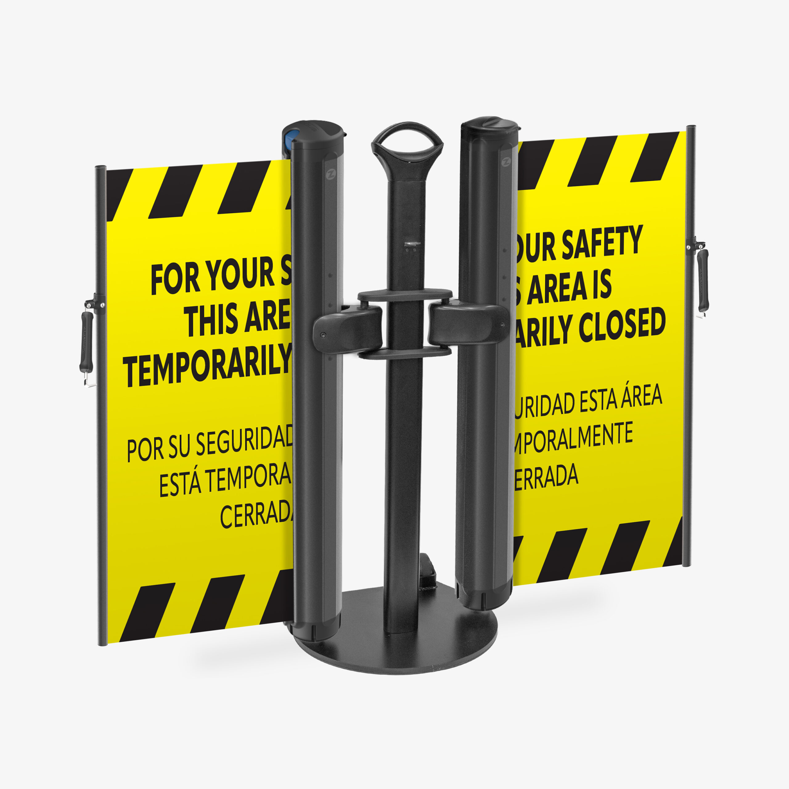 Pre-printed banners read “Area Temporarily Closed” in English and Spanish, double-sided for maximum visibility.